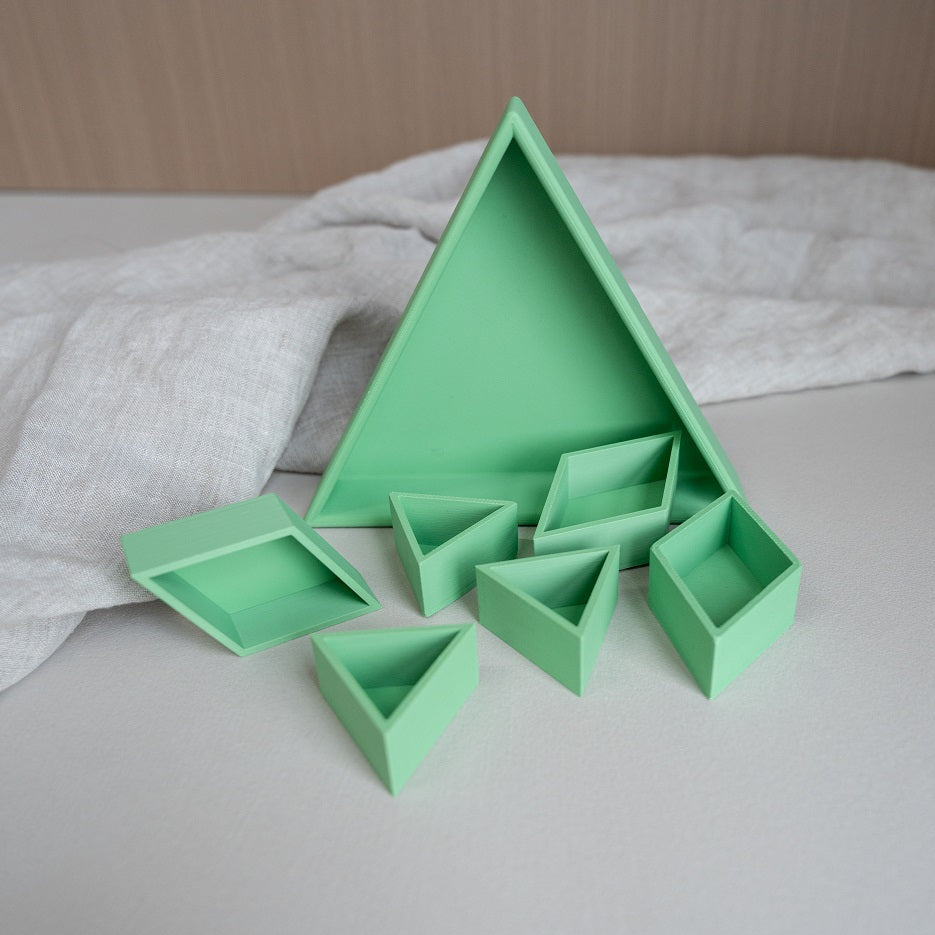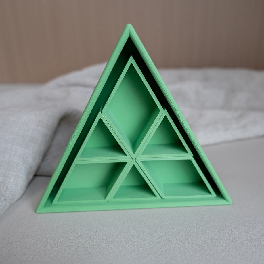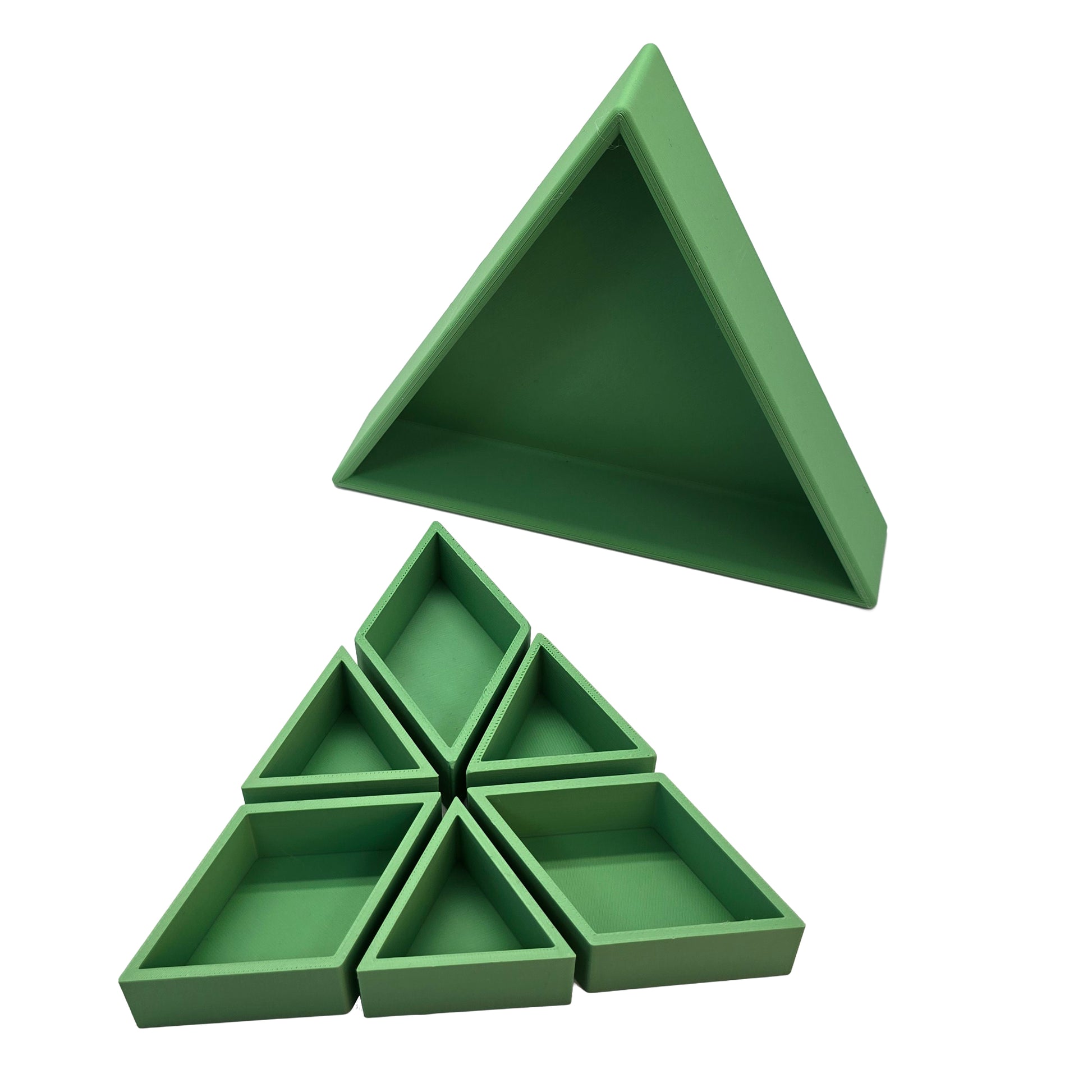 De vorm van de driehoek creëert een duidelijk en stevig vakje. Dat maakt het sorteren van materialen heel eenvoudig. Magic sand, speelrijst, kleine accessoires, stekers of mini speelgoed krijgen allemaal hun eigen plek.