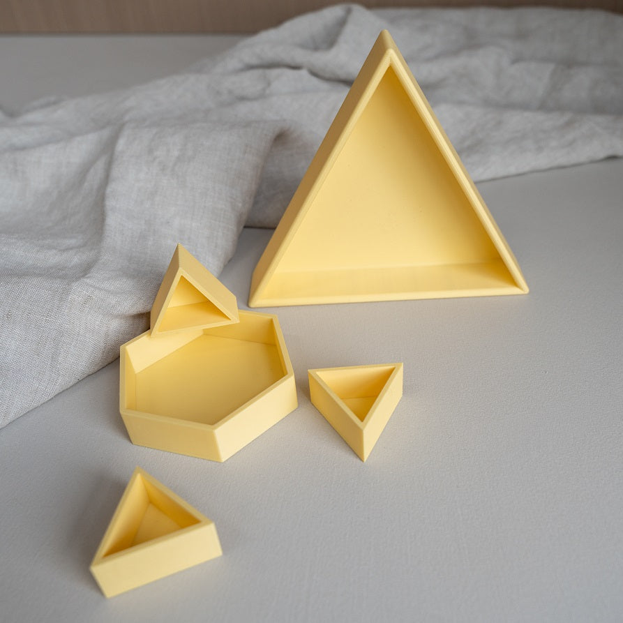 De Mandigo inlegdriehoeken van Grennn zijn ontwikkeld om spel en opbergen zo overzichtelijk mogelijk te maken. Elke driehoek is los verkrijgbaar, waardoor je volledig vrij bent in het samenstellen van je eigen kleurencombinatie. Zo kun je de zeshoek precies indelen op de manier die past bij jouw collectie of bij het thema waarmee kinderen spelen.