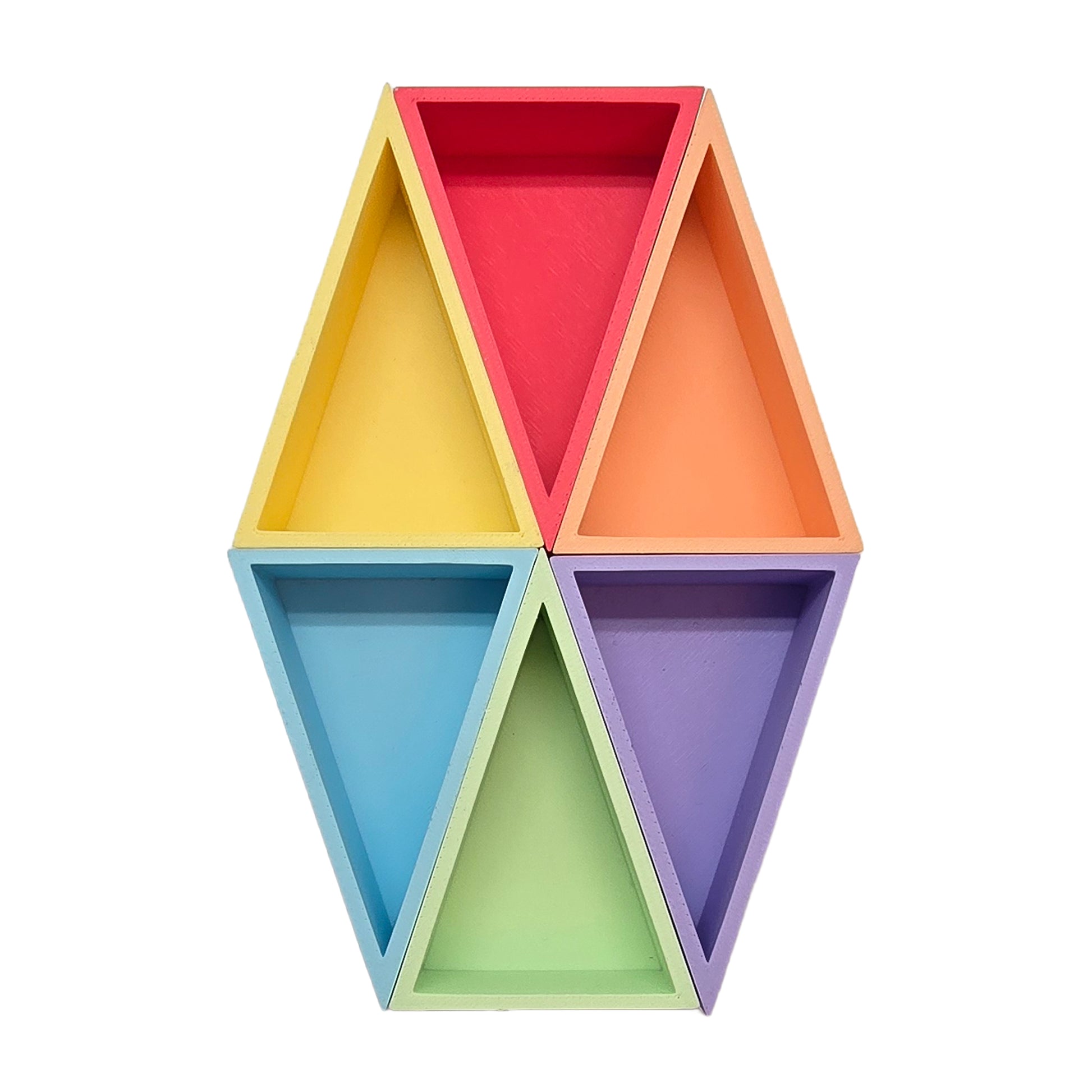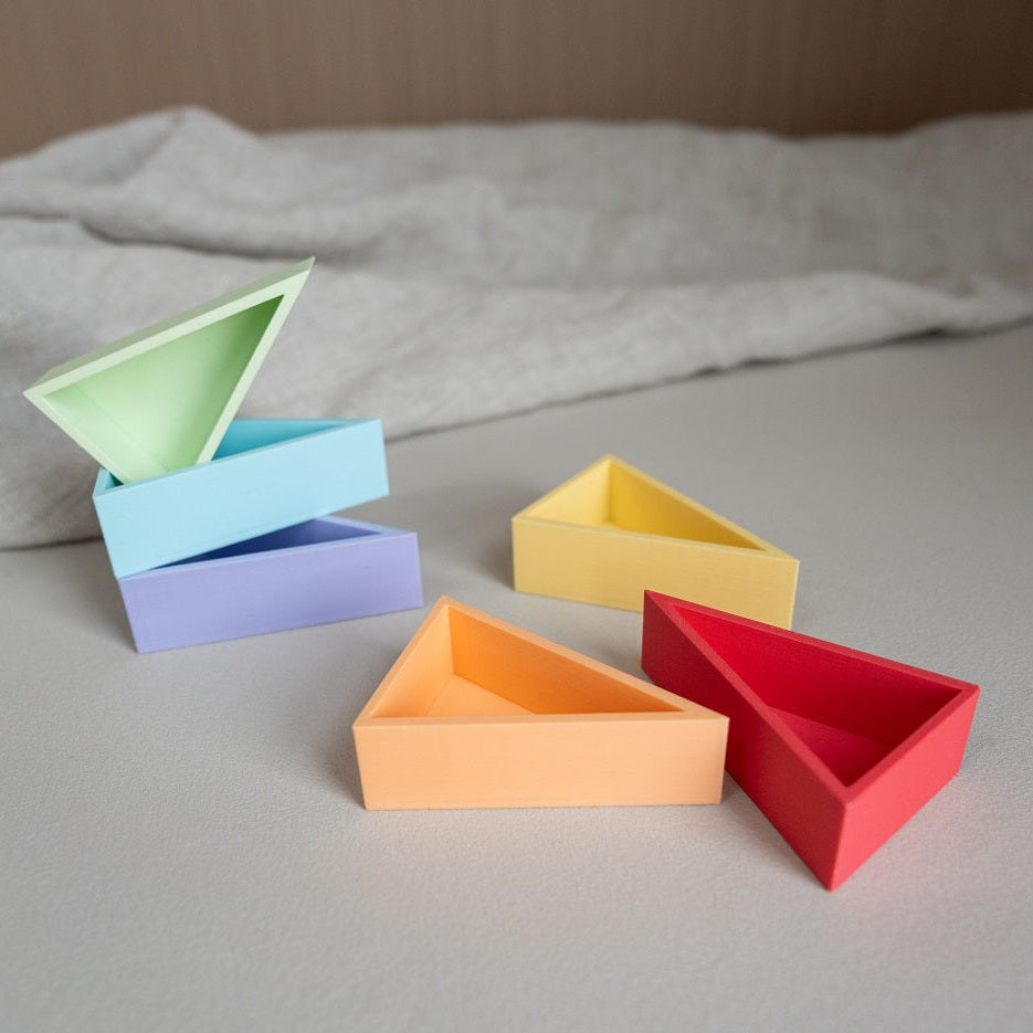 De mandigo driehoek bakjes zijn ontworpen om materialen overzichtelijk te sorteren tijdens sensorisch spel. Elk bakje heeft dezelfde vorm en kan eenvoudig gecombineerd worden met andere kleuren. Ze zijn verkrijgbaar in zowel regenboog- als pasteltinten, zodat je precies het kleurenpalet kunt kiezen dat past bij jouw speelhoek of thema.