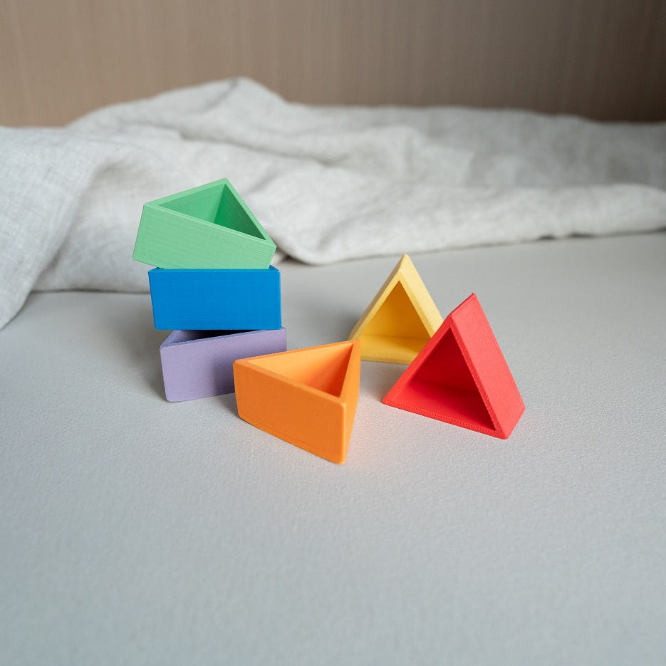 De mandigo driehoek bakjes zijn ontworpen om materialen overzichtelijk te sorteren tijdens sensorisch spel. Elk bakje heeft dezelfde vorm en kan eenvoudig gecombineerd worden met andere kleuren. Ze zijn verkrijgbaar in zowel regenboog- als pasteltinten, zodat je precies het kleurenpalet kunt kiezen dat past bij jouw speelhoek of thema.