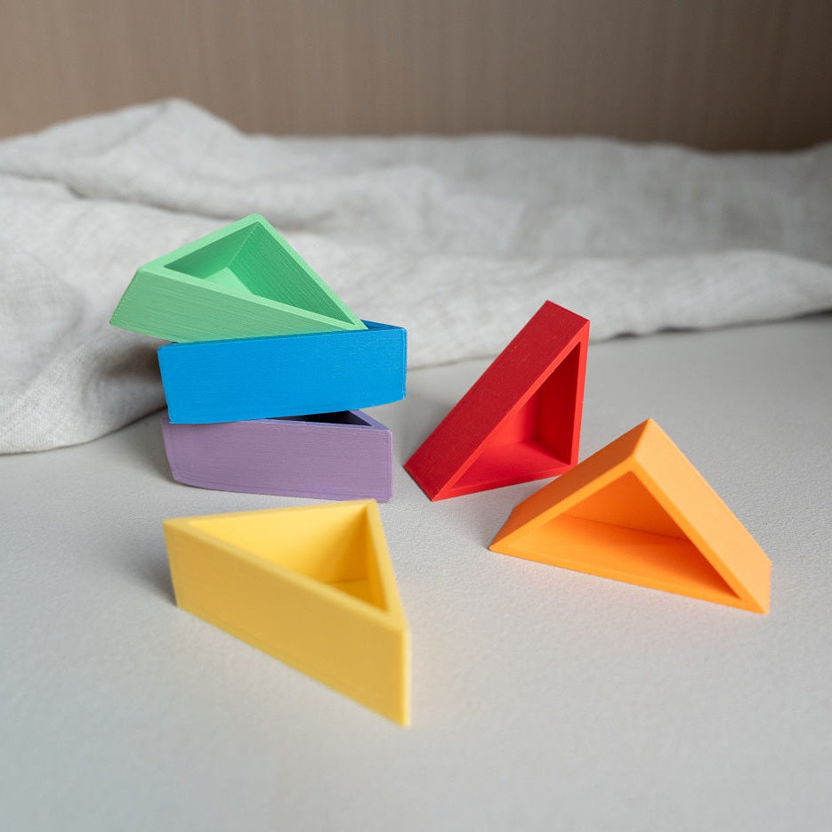 De mandigo driehoek bakjes zijn ontworpen om materialen overzichtelijk te sorteren tijdens sensorisch spel. Elk bakje heeft dezelfde vorm en kan eenvoudig gecombineerd worden met andere kleuren. Ze zijn verkrijgbaar in zowel regenboog- als pasteltinten, zodat je precies het kleurenpalet kunt kiezen dat past bij jouw speelhoek of thema.